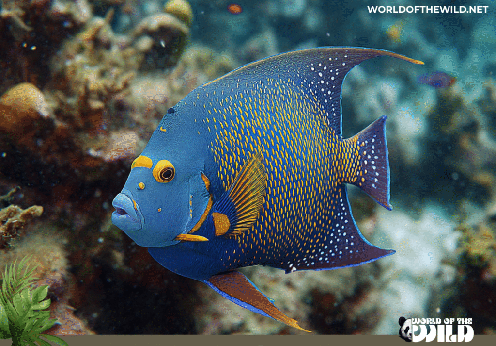 - Crown Jewel Identification: The species gets its royal name from a distinctive cobalt blue “crown” spot on its forehead, encircled by electric blue and dotted with bright blue speckles, which distinguishes it from its close relative, the Bermuda blue angelfish.