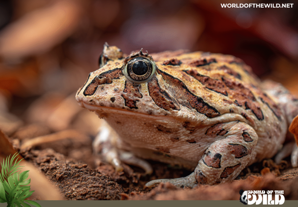 The “horns” that give this species its common name are actually pointed skin projections that extend above each eye, resembling small, fleshy spikes. These projections may help break up the frog’s outline when buried, making it less recognizable as prey approaches. The eyes themselves are large and positioned high on the head, allowing the frog to remain almost completely buried while still monitoring its surroundings.