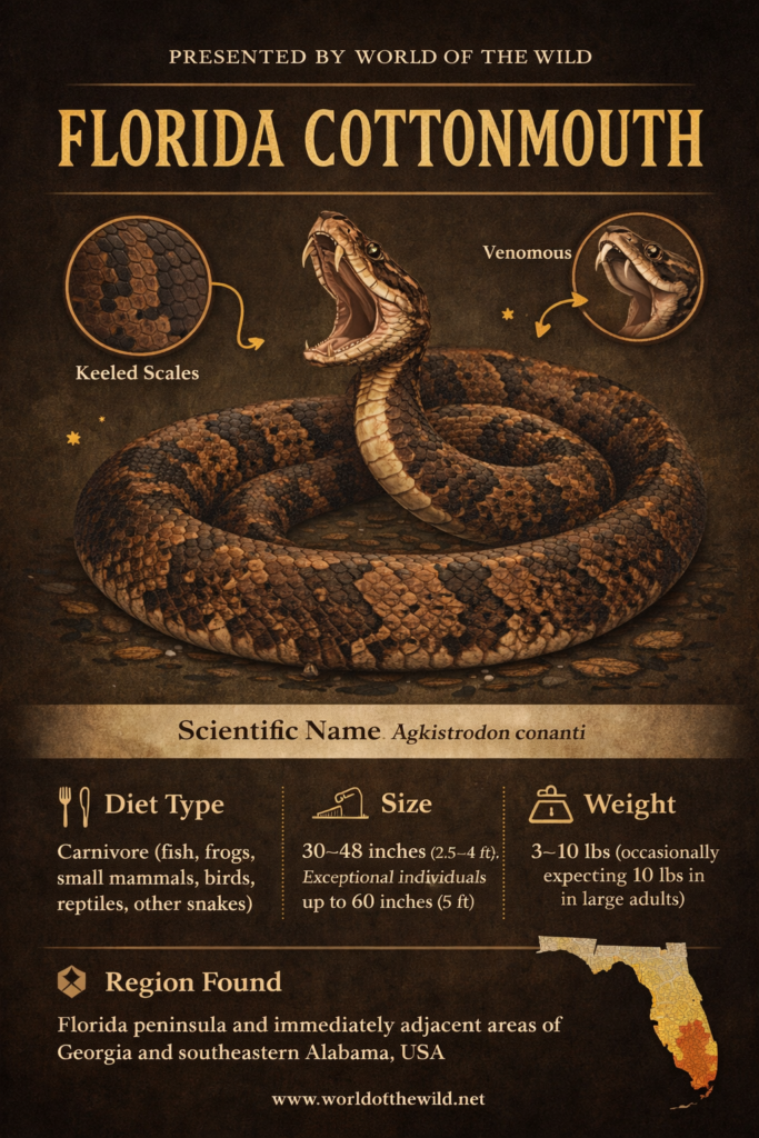 That flash of brilliant white is not a threat. It is a warning — and one of the most iconic displays in all of North American wildlife. The Florida Cottonmouth (Agkistrodon conanti) is a snake that has earned its fearsome reputation, but beneath the mythology and the mistaken identities lies one of the most ecologically vital, behaviorally fascinating, and evolutionarily remarkable animals in the American Southeast. It is a creature simultaneously dreaded and misunderstood, persecuted by the uninformed and celebrated by herpetologists and naturalists alike. To truly know the Florida Cottonmouth is to appreciate the raw elegance of a perfectly adapted predator — one that has patrolled the wetlands of the Sunshine State for millions of years and shaped the ecosystems it inhabits in ways most people never consider.